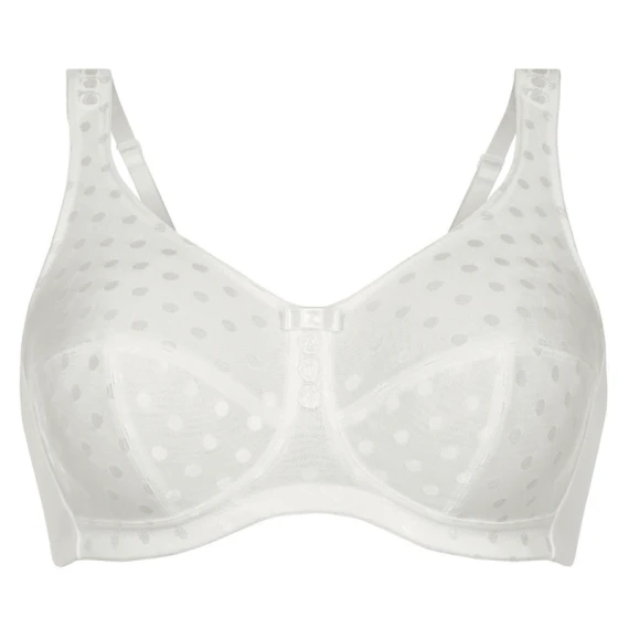 Der Airita Komfort BH von Anita ist in der Farbe Crystal erhältlich. Die Cups dieses Elfenbeinfarbenen BHs bestehen aus einem weichen Jacquard Stoff mit einem Tupfenmuster. Das Tüllfutter gibt Stabilität und ist wunderbar atmungsaktiv. Ein echter Hingucker ist die Stickerei auf dem Dekolleté, sehr elegant! Die breiten, gepolsterten Träger erleichtern den Nacken- und Schulterbereich auf angenehme Weise.