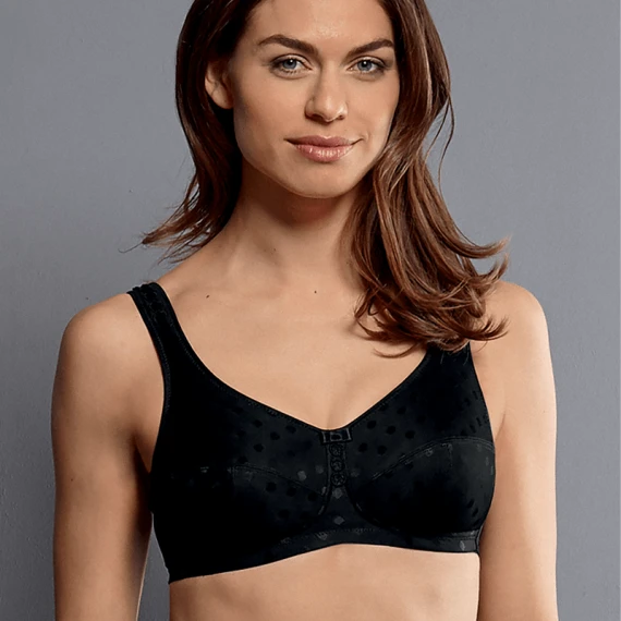 Der Airita Komfort BH ohne Bügel von Anita ist in der Farbe Schwarz erhältlich. Die Körbchen dieses BHs sind aus weichem Jaquard Stoff mit kleinen Pünktchen. Das Futter aus Tüll bietet Stabilität und ist atmungsaktiv. Ein echter Hingucker ist die Stickerei am Decollete. Die breiten gepolsterten Träger entlasten den Nacken- und den Schulterberich auf angenehme Art und Weise.