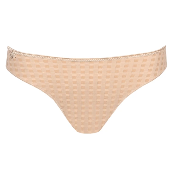 Der Avero Rioslip von Marie Jo in der Farbe Caffé Latte. Dieser hellbeige Slip ist ein schöner Kompromiss zwischen Eleganz und Tragekomfort. Da der Slip an den Seiten recht hoch geschnitten ist, wirken Ihre Beine optisch länger. Der Slip ist mit drei Blumen in der Mitte und an den Seiten verziert.