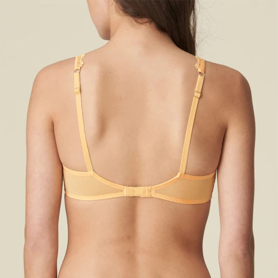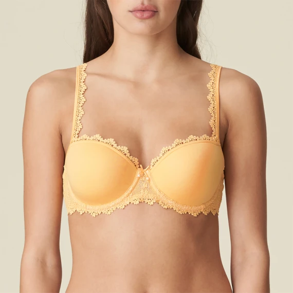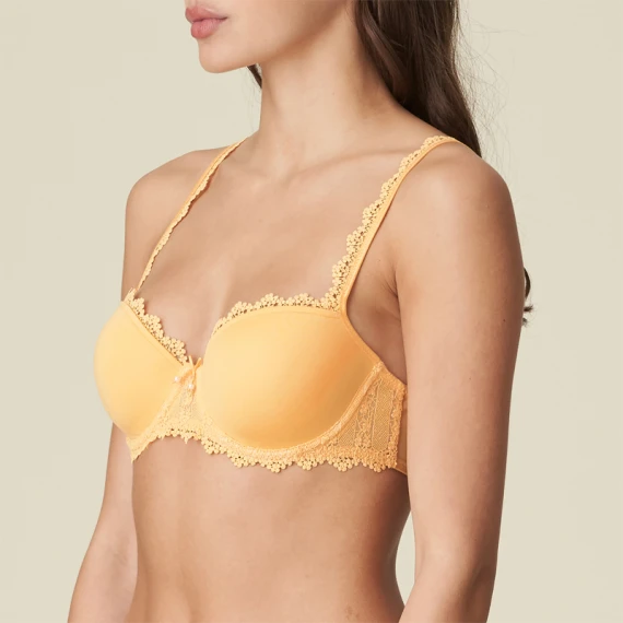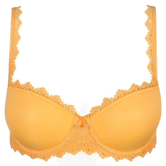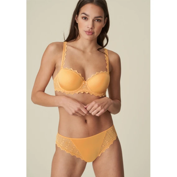 Der Christy vorgeformte Balconette-BH von Marie Jo ist in der Farbe Mango erhältlich. Dieser gelbe BH hat glatte Mousse-Cups, die den Busen schön zentrieren. Um die Cups und Träger herum ist schöne Broderie verarbeitet. Die Rückseite ist halbtransparent. Romantisch und äußerst raffiniert! Mango ist ein wunderschöner Gelbton. Ein wahrer Genuss für die Augen…