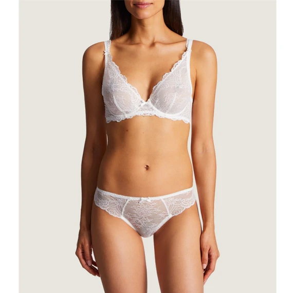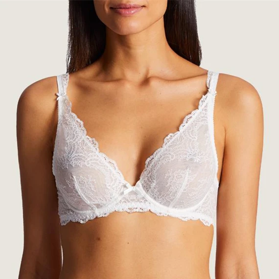 Der Danse des Sens Plunge BH von Aubade ist in der Farbe Opale erhältlich. Dieser wunderschöne BH ist komplett mit sexy elfenbeinfarbener Leavers-Spitze überzogen. Zwischen den Cups und an den Trägern befindet sich eine süße kleine Schleife. Die Ränder der Cups und ein Teil der Träger sind mit elastischer Spitze verarbeitet. Dieser BH hat einen sexy, tiefen Ausschnitt und die Körbchen zentrieren den Busen schön. Kombinieren Sie diesen schönen Bügel-BH mit einem der Slips aus der Kollektion Danse des Sens.