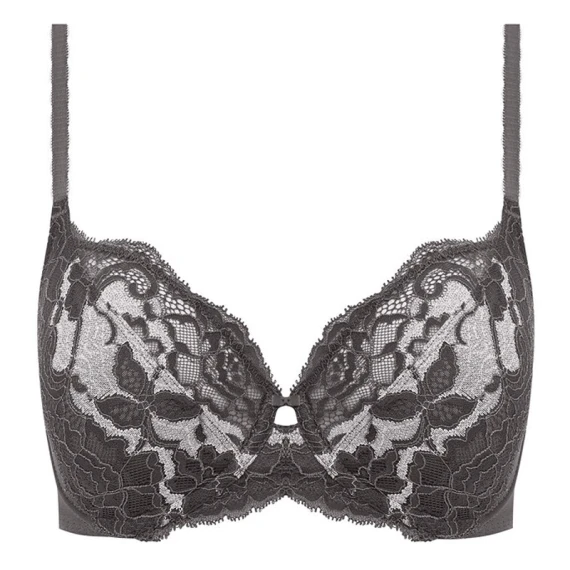 Der Bügel BH Florilege von Wacoal ist in der Farbe Inky Flower erhältlich. Dieser graue BH ist mit weißen Spitzendetails verziert. Zwischen den Spitzen wurde eine fortschrittliche japanische Webtechnik verwendet, die ein weiches Material und matte Details erzeugt. Der obere Teil des BHs ist leicht durchscheinend, so dass der Busen nicht vollständig bedeckt ist. Die nicht vorgeformten Körbchen verleihen dem Busen eine natürliche Form. Kombinieren Sie diesen BH mit einem der Florilege Slips.
