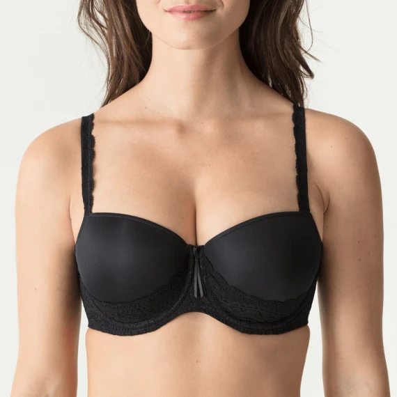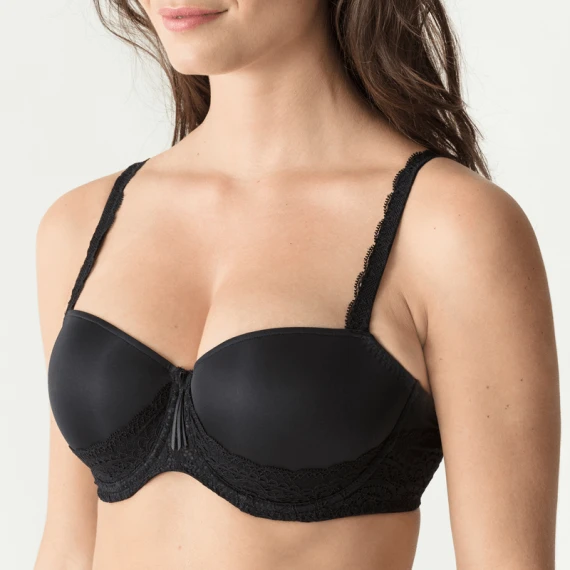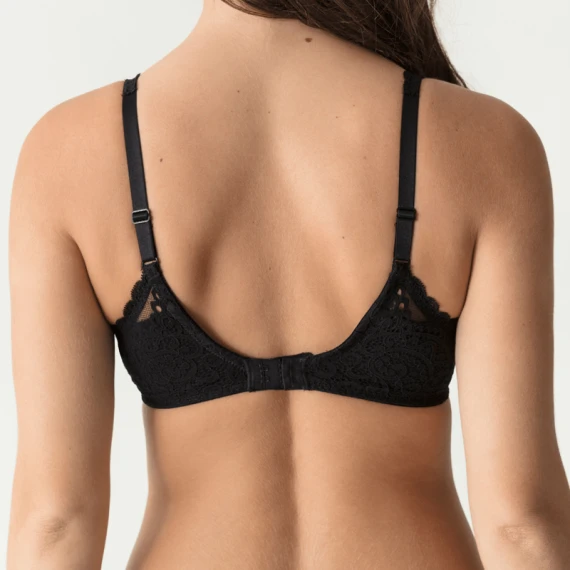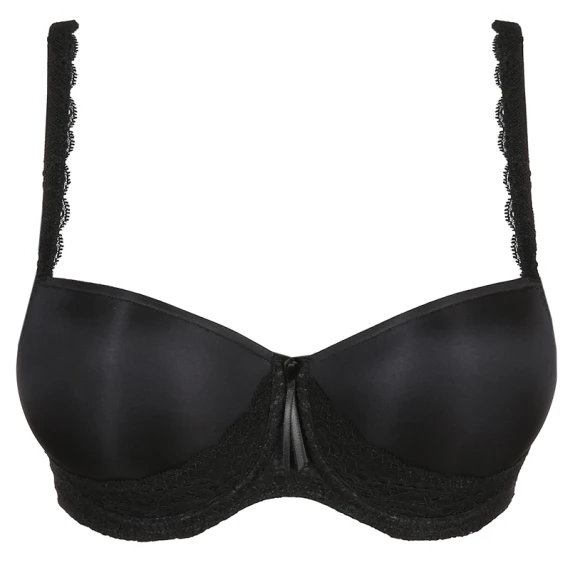 Der vorgeformte Balconette BH von PrimaDonna Twist ist in der Farbe Schwarz erhältlich. Dieser schwarze, elegante BH besteht aus einem glänzenden Satinstoff. An der Unterseite der Cups ist ein Spitzenmuster drapiert, das an den Seiten und auf der Rückseite des BHs verläuft. Zwischen den Cups ist ein verspieltes Detail angebracht, um den Look zu vervollständigen.