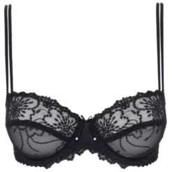Der Jane Balconette-BH von Marie Jo in der Farbe Schwarz. Dieser schwarze BH hat eine zierliche romantische Blumenstickerei. Das Modell ist etwas tiefer geschnitten und bietet damit mehr offenes Decollete. Daher eignet sich dieser Bh ideal unter tief ausgeschnittener Kleidung. Ideal für Frauen mit einer weicheren Oberbrust oder für jede die ein sinnliches Decollete möchte.