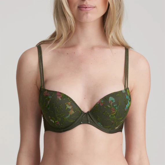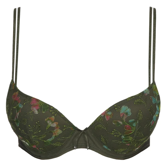 Der Push-Up-BH Joanna von Marie Jo ist in der Farbe Forest erhältlich. Dieser grüne BH verführt mit seinem überraschenden floralen Design und seiner schönen Passform. Die Körbchen dieses BHs heben Ihren Busen schön an und zentrieren ihn nach vorne. Raffinierte Details wie der goldene Faden in den Trägern und die Schleife zwischen den Cups machen diesen BH komplett! Forest ist ein modischer Khaki-Farbton mit zartem floralem Muster.