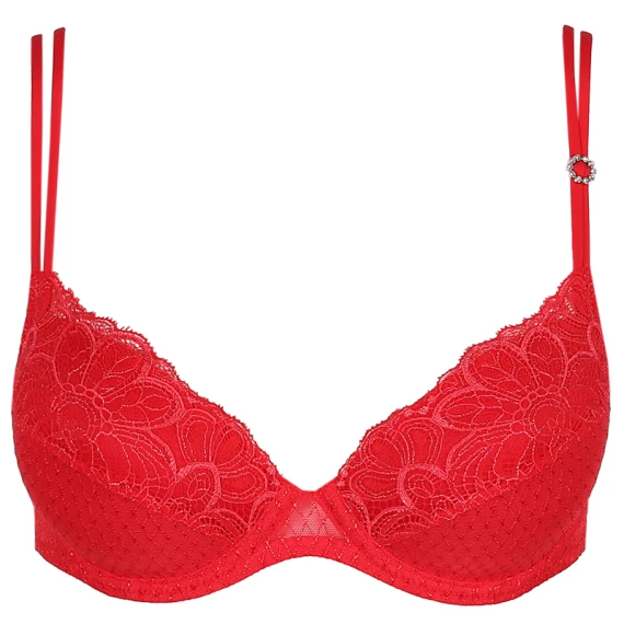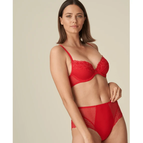 Der Linda Plunge-BH von Marie Jo in der Farbe True Red. Die Körbchen dieses BHs sind mit luxuriöser Blumenspitze aus Frankreich verziert. Dies macht den Bh zum echten Hingucker. Die Seiten des BHs sind aus durchsichtigem Meshstoff. Vorne hat der BH je zwei dünne Spaghettiträger und ein zierliches Steinchen. Die Körbchen sind tief ausgeschnitten, so wird das Decollette schön betont. True Red ist ein leidenschaftliches Rot: Ein unentbehrliches Dessous!