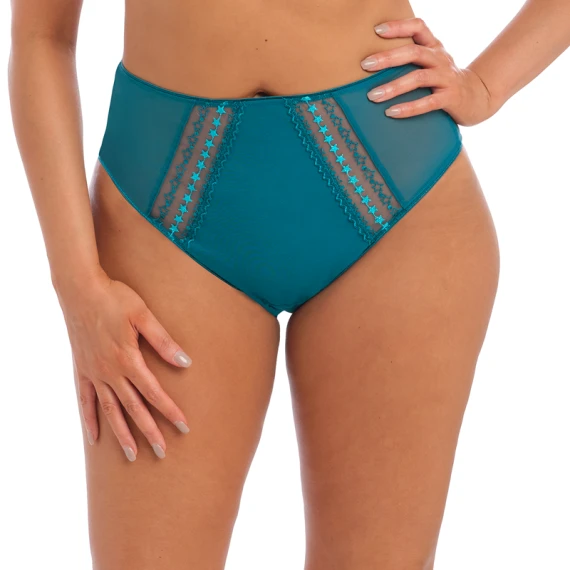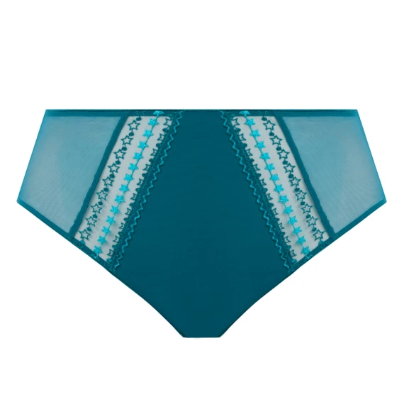 Der Matilda Taillenslip von Elomi ist in der Farbe Blue Star erhältlich. Dieser blaue Slip ist in der Mitte aus einem festen Stoff gefertigt. Die Seiten und der Rücken sind aus einem elastischen, durchsichtigen Stoff gearbeitet. Der Slip ist mit eleganten, türkisfarbenen Sternen bestickt. Sehr verspielt! Die hohe Taille sorgt dafür, dass Ihr Bauch schön kaschiert wird.