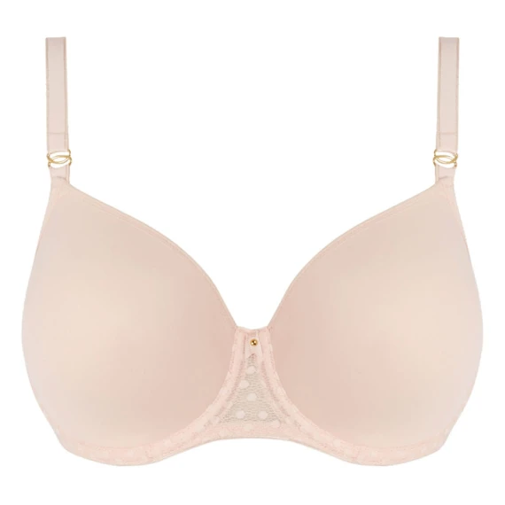 Dieser hellrosa BH hat glatte, nahtlose Cups, so dass der BH perfekt unter enger Kleidung getragen werden kann. Um die Cups herum ist ein Pünktchen Muster und zwischen den Cups sitzt eine kleine, süße Schleife. Da die Bügel zwischen den Cups etwas höher abschließen, bietet der BH optimalen Halt.